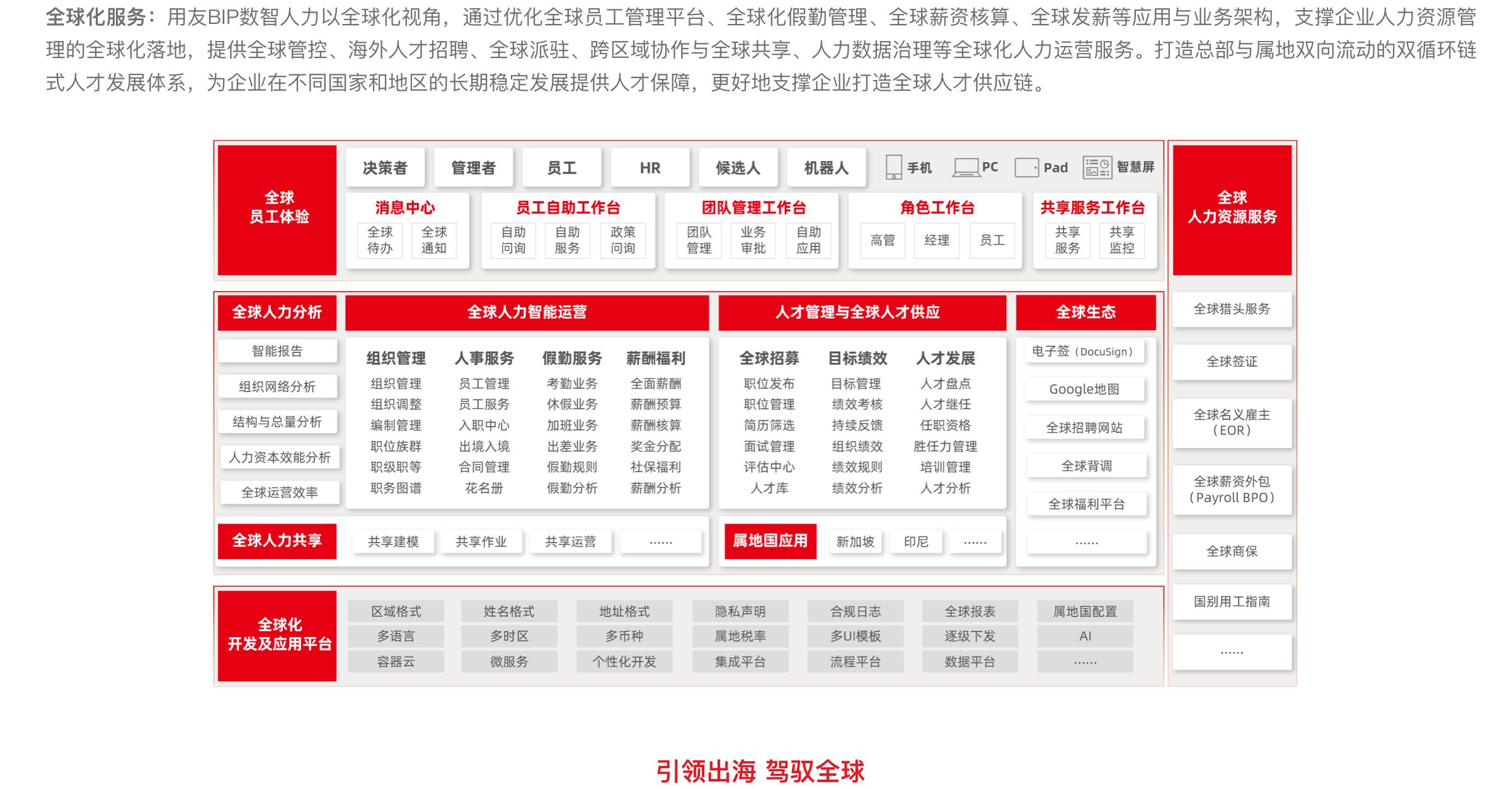 用友 BIP 人力云是用友 BIP 旗下 AI 驱动的数智化人力资源管理平台,覆盖员工全生命周期管理,集成全球人力管控、智能招聘、薪酬绩效、人才发展与合规风控等能力,适配集团及跨国企业人力资源数智化转型与全球人才供应链管理需求