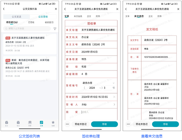 支持公文分发、签收、登记、转办等操作在移动端完成;