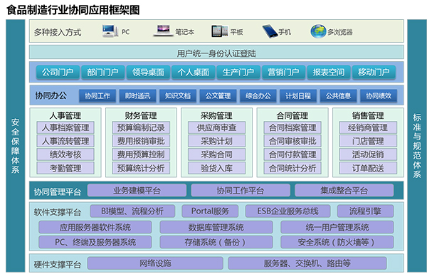 集成整合:与供应链系统、财务系统、质检系统等食品制造业专有的业务管理系统有效整合,实现消息同步、数据互通、流通关联,最终建立起应用融合、数据共享的一站式企业经营管理平台。