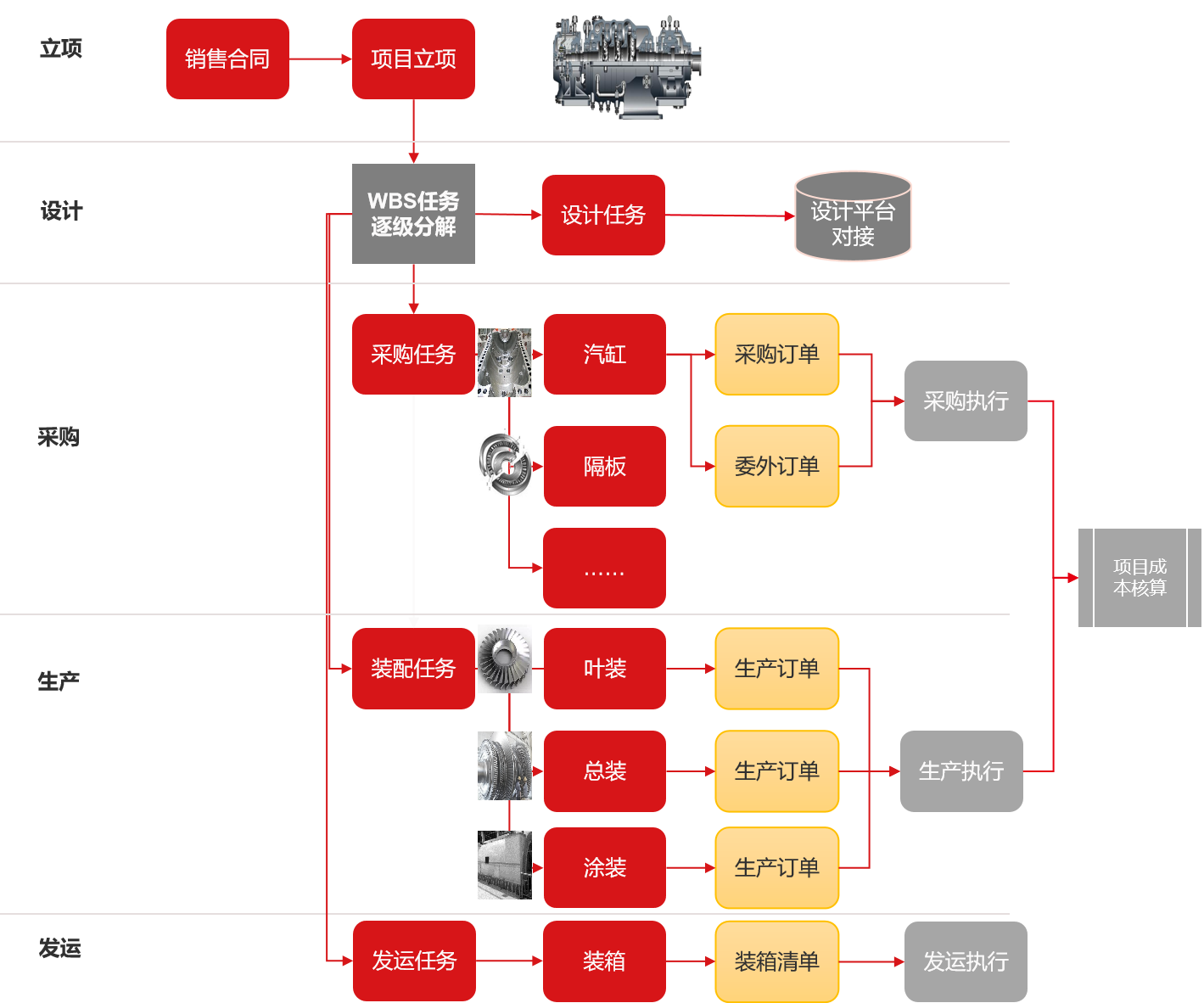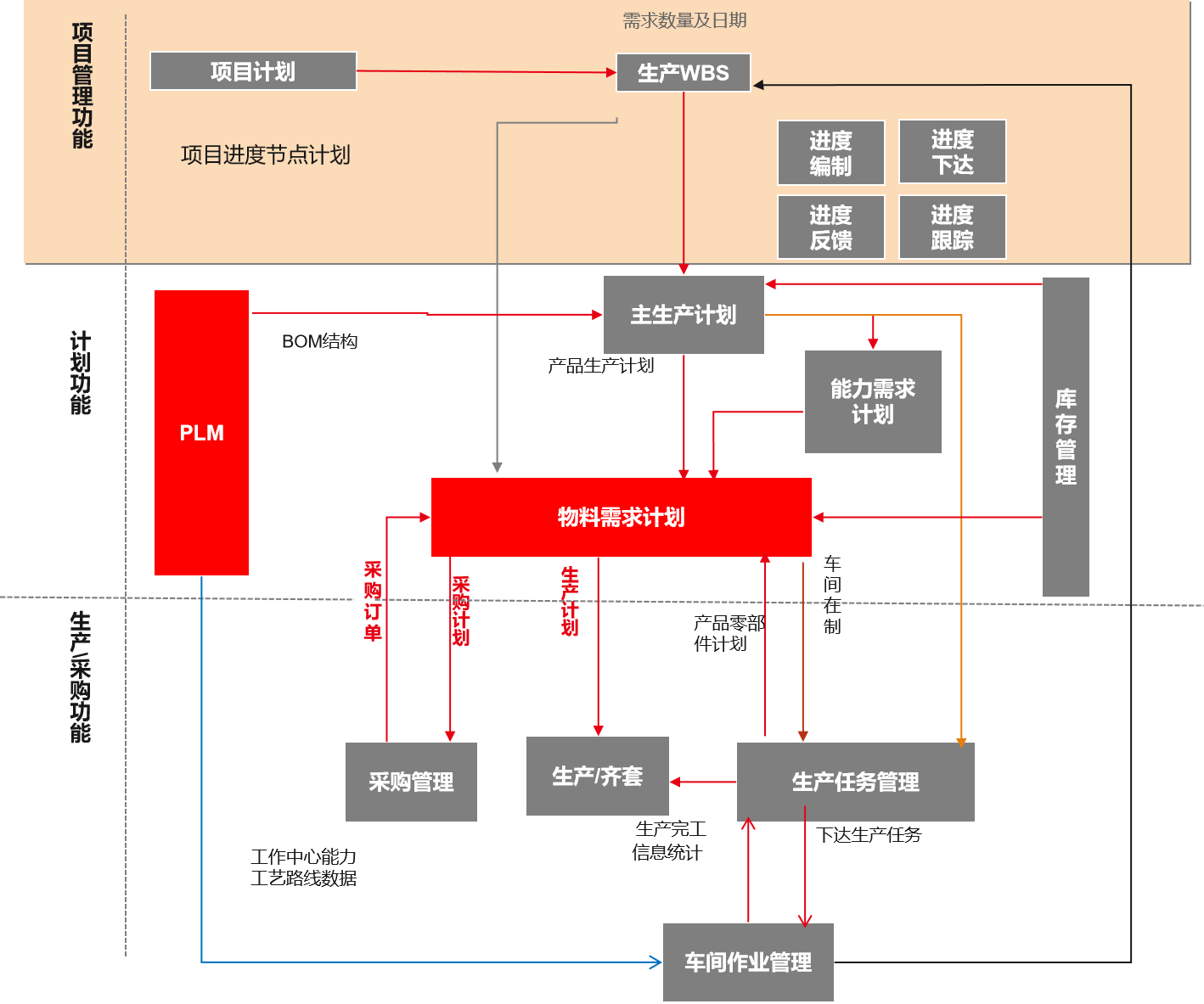 以项目进度计划驱动生产计划,对项目进度计划逐层分解,达到以项目进度计划驱动生产计划的目的。通过进度计划编制、下达、 调整和跟踪等手段,对项目的WBS计划、生产计划、车间计划进行层层分解与管控。