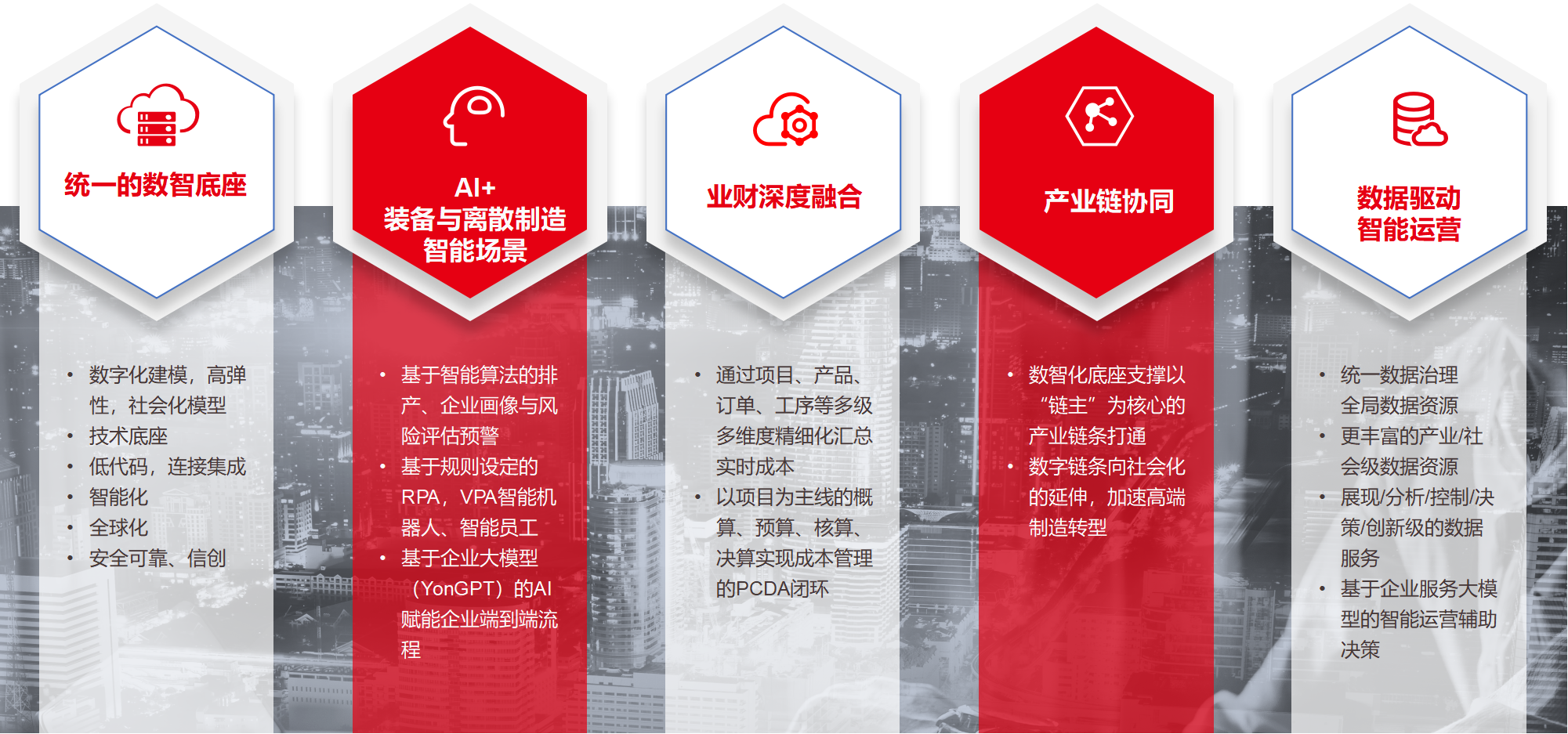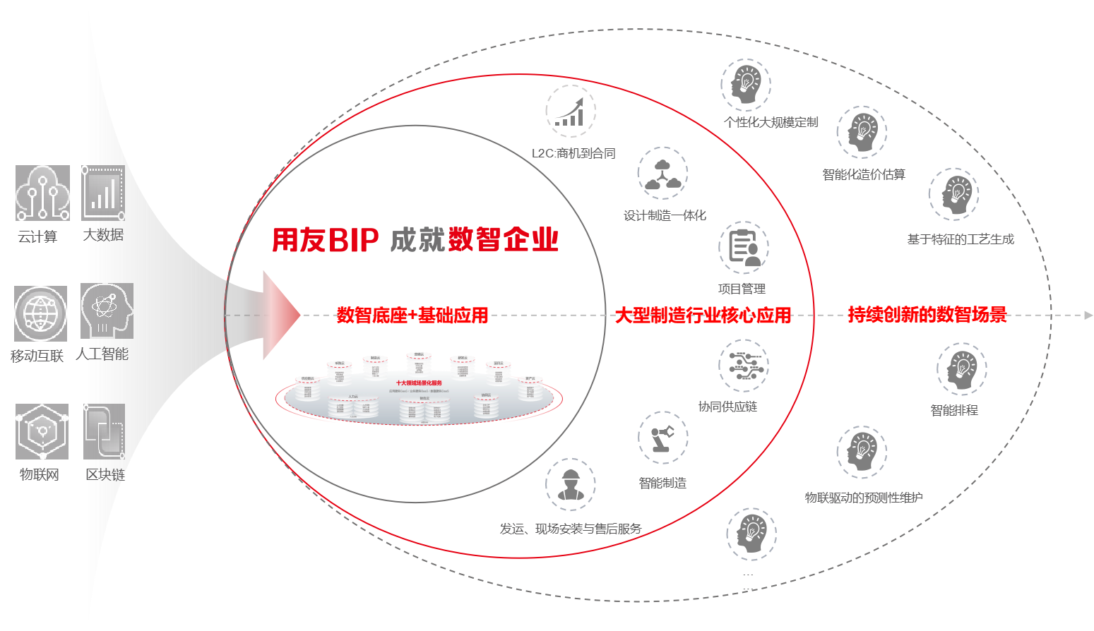 云计算、大数据等新技术和手段越来越广泛的被应用到企业数智化平台与解决方案的各个环节, 用友装备与离散制造行业基于用友BIP数智底座,与行业化核心应用深度融合,为行业客户提供智能化场景,帮助企业实现数据驱动,助力企业智能运营。