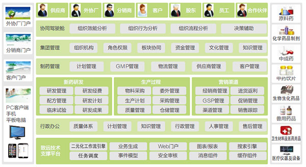 以协同为定位的致远协同管理平台,以工作协同为定位,以目标管理为关键,以业务定制为方向,以流程审批为基石,为医药行业协同过程信息化提供应用解决方案。